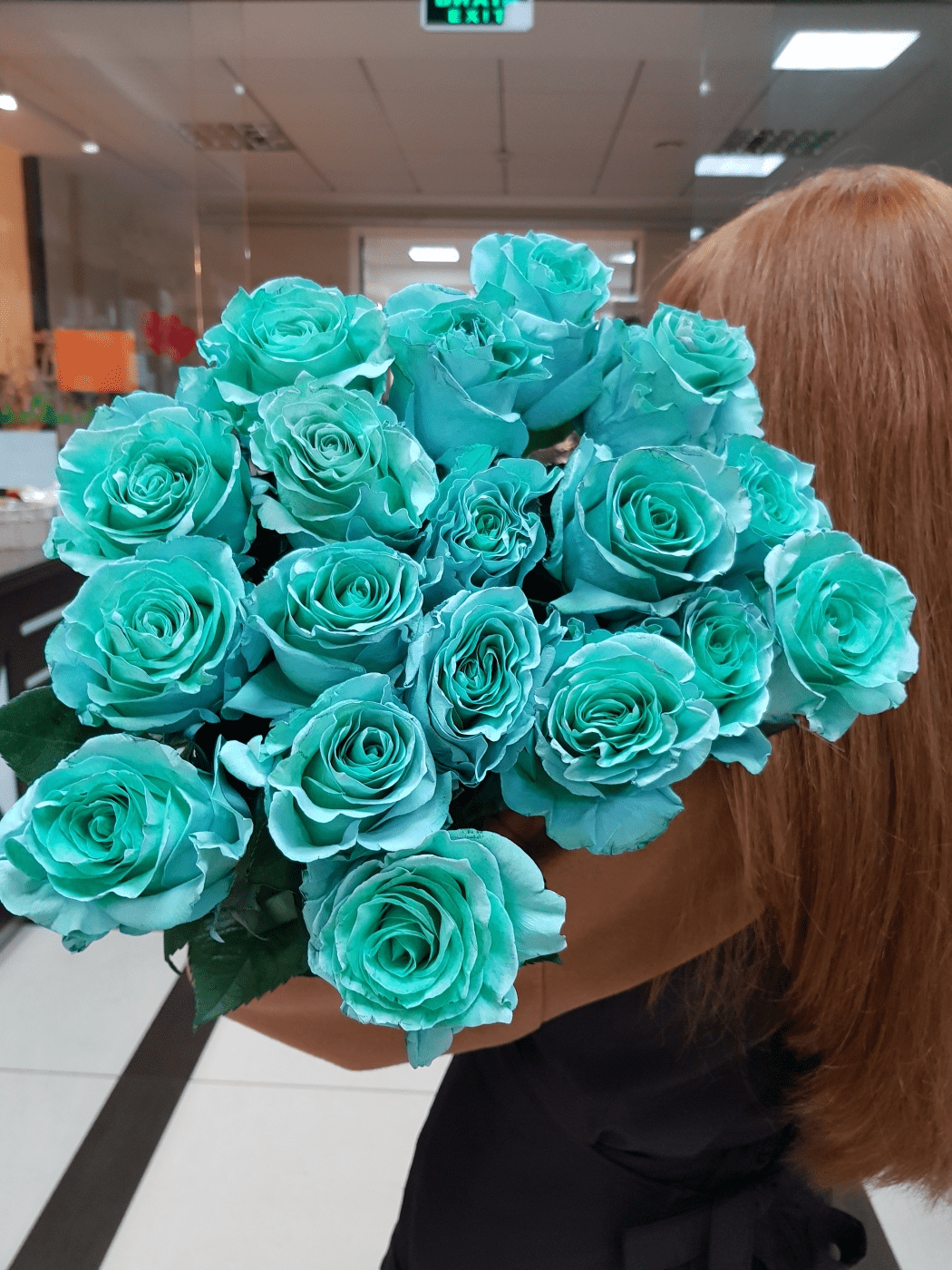 - Букеты из роз. Вы можете выбрать готовые композиции из роз разных цветов и видов. В каталоге представлена обычная роза, а также пионовидная и кустовая. Что касается цветовой гаммы, клиентов впечатляет огромный выбор оттенков. Здесь можно найти и обычные, красные, белые, желтые розы, а также экзотические — сиреневые, бирюзовые и другие.